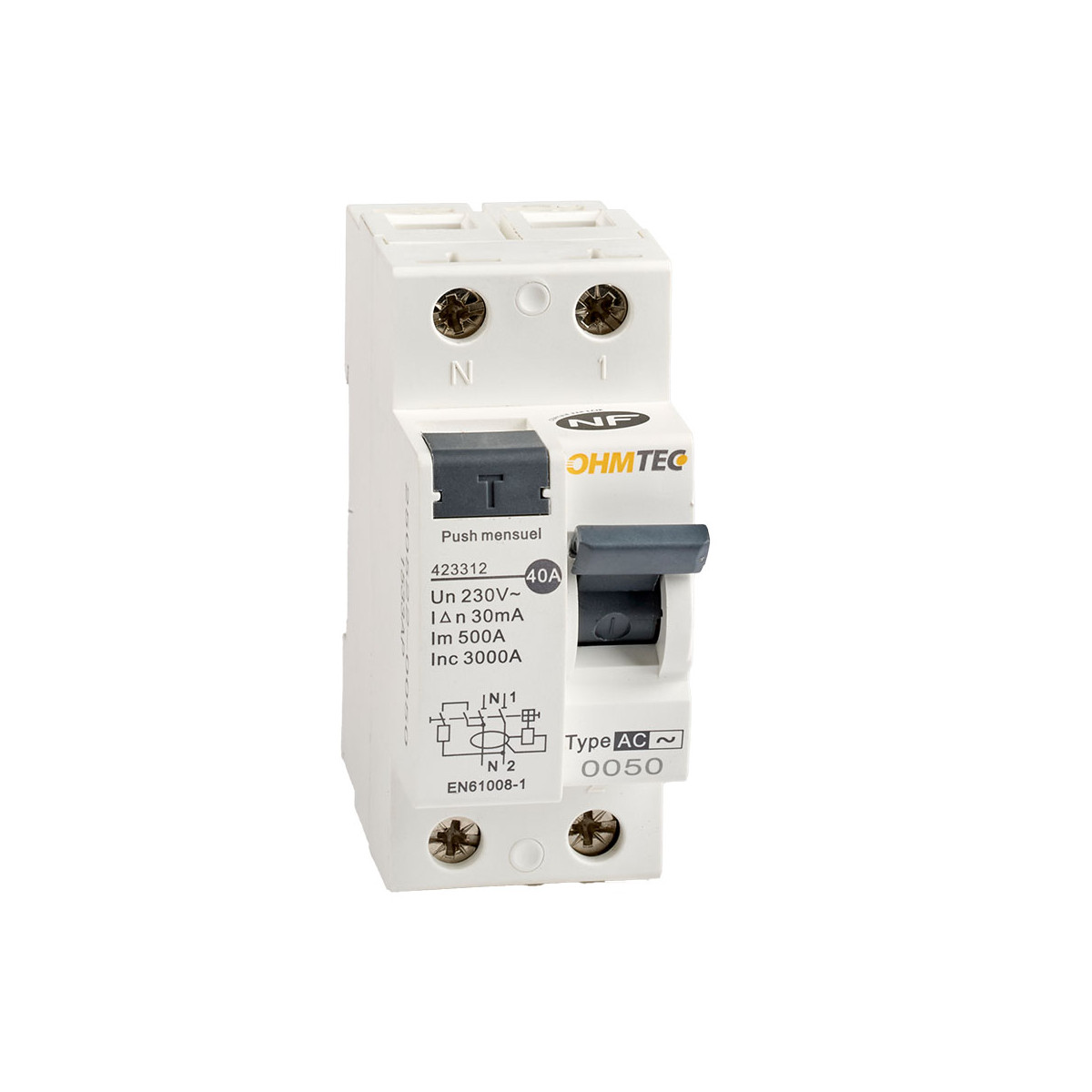 Interrupteur différentiel 40A 1P+N type AC OHMTEC. Conforme à la norme EN 61008-1.