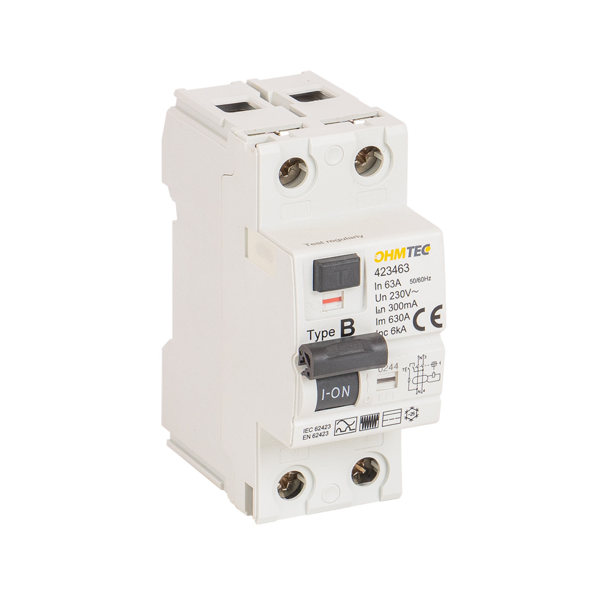 Interrupteur différentiel 63A 300mA 1P+N type B OHMTEC. Conforme à la norme EN 61008-1.